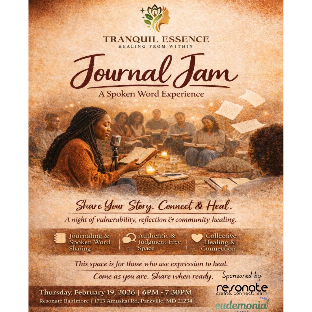 Journal Jam- A Spoken Word Experience Thursday, February 19, 2026 6:00 PM 7:30 PM Resonate Baltimore 1713 Amuskai Road Parkville, MD, 21234 United States (map) Google Calendar ICS Free RSVP